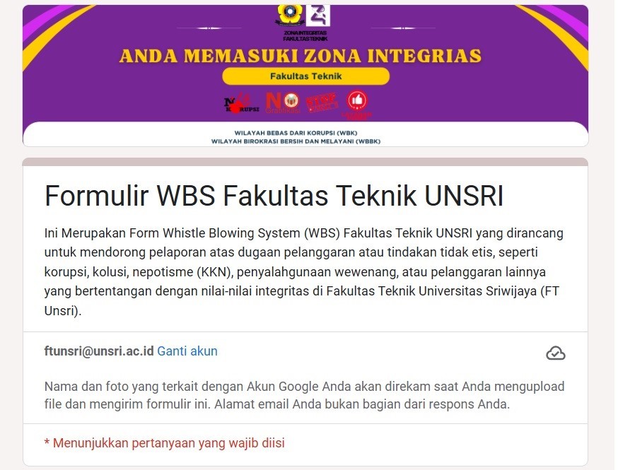 Formulis Whistle Blowing System (WBS) Zona Integritas Fakultas Teknik / Pengumuman / By tester Berikut link formulir Whistle Blowing System Fakultas Teknik Unsri : https://bit.ly/4iY3PlW
